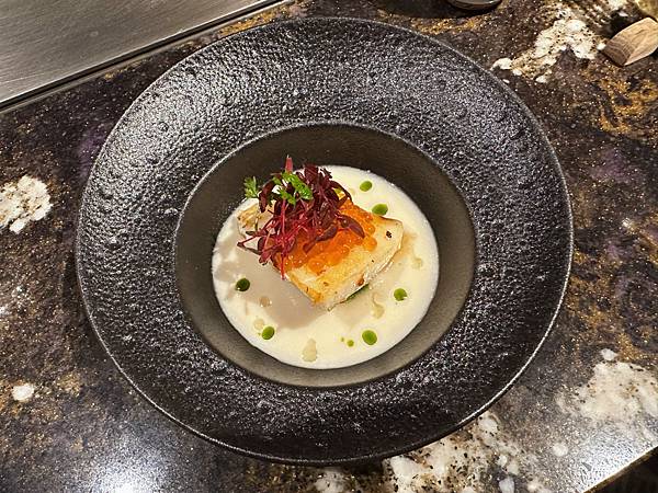 藍鑽龍斑魚淋上鮭魚卵搭配法式濃湯,魚的肉質很鮮嫩,層次鮮明豐富。