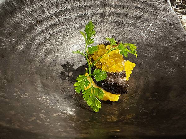 頂端是橄欖油魚子醬,搭配鮑魚和山蘿蔔葉,
