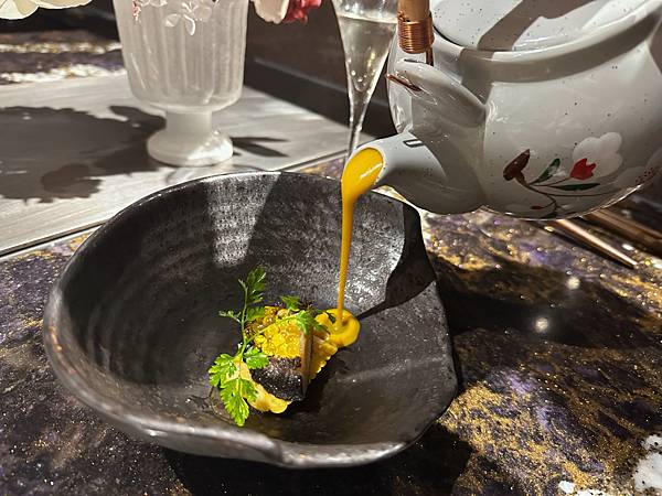 最後淋上胡蘿蔔和洋蔥燉煮的濃湯,味道濃郁而不膩。