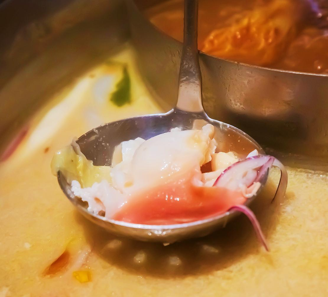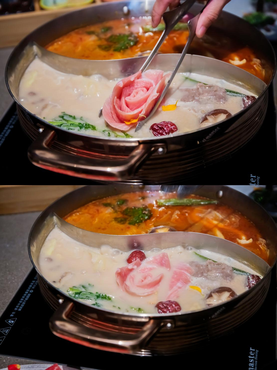 為了跟熊熊見面,火鍋最重要元素之一的湯底,愛麗絲當然選擇了冰磚。至於另一邊,自然是色香味俱全的中式麻辣!