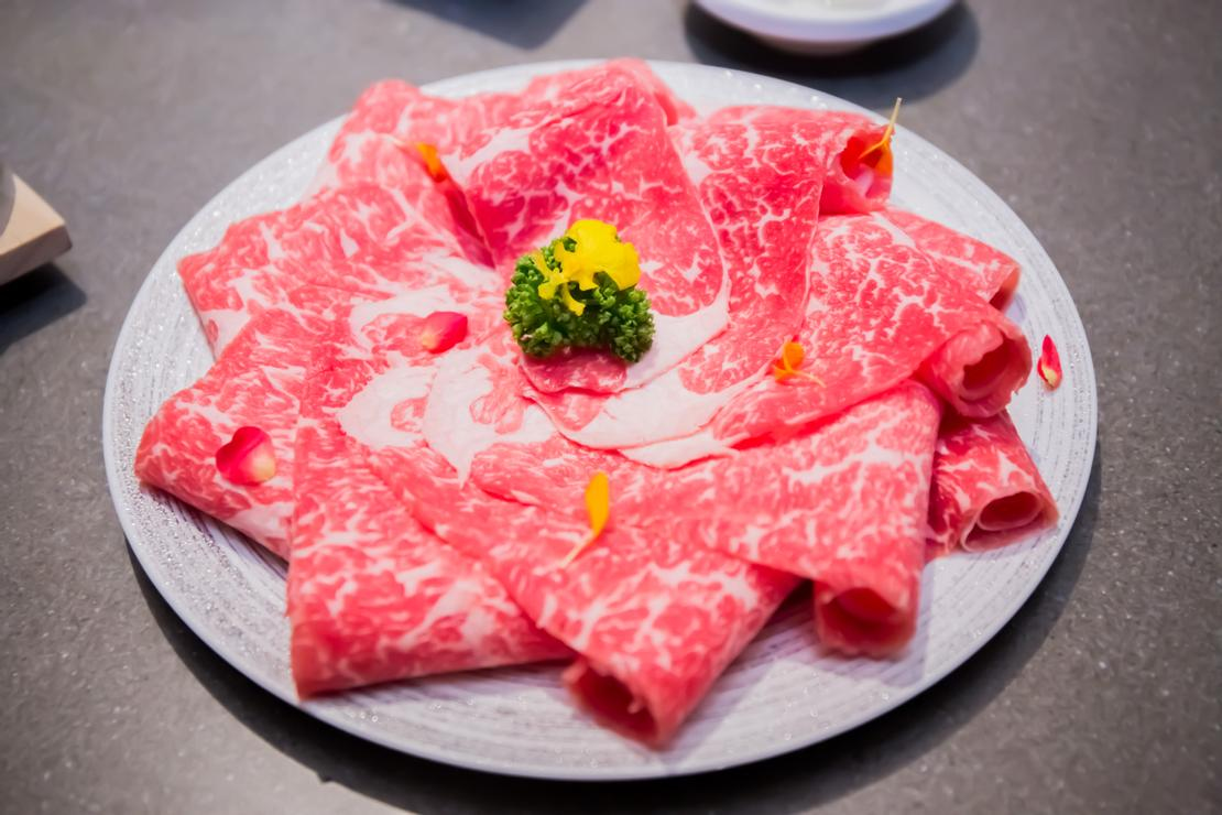 「覓奇頂級日式火鍋」不只是海鮮食材拔尖兒好,肉品也是超高顏值喔!光看這美國PRIME熟成自然牛,厚度實在的大理石般油花,就知道這口感會有多好,口感綿細滑順,入口一整個脂香十足,讓人不住一片又一片