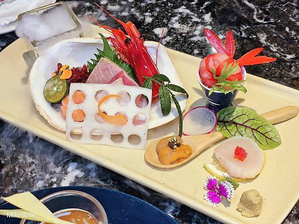 覓奇菁饌 師傅將新鮮山葵現磨成的哇沙米,在提升味道層次的同時,不會過於嗆辣,金箔海膽和大蝦完全無腥味的海味鮮甜令人回味再三 ![]()
