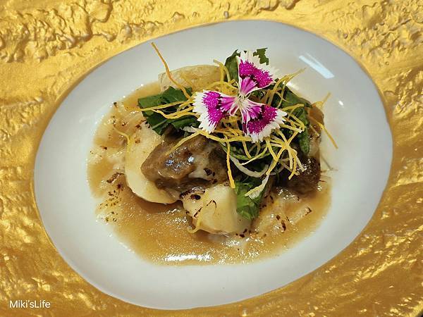 覓奇菁饌 淋上秘製醬汁燒烤的美露圓鱈西京燒風味超誘人,鎖住鮮魚油脂和肉汁,上方結合台東洛神花蜜餞完全無違和