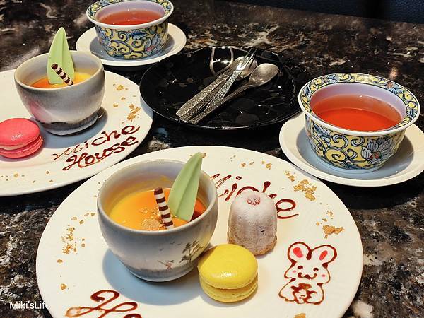 餐末的手工南瓜布丁超好吃,還有我很愛的藍帶甜點【朵莉甜廚】精緻甜點,馬卡龍和乳酪塔,與黃金山脈瑪黑茶一起享用大滿足